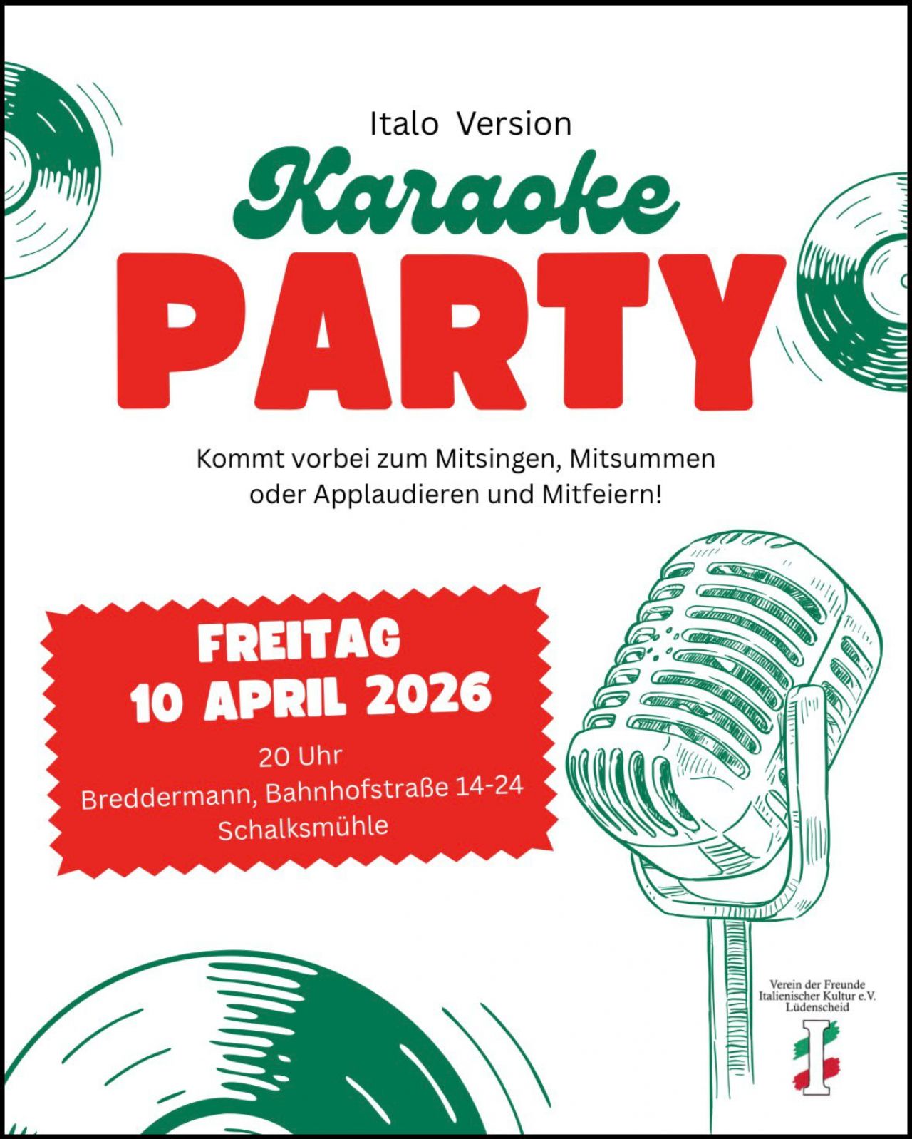 Verein der Freunde ital. Kultur e.V. Lüdenscheid58762 Bahnhofstr. 13AltenaAnsprechpartner:in: Patrick Vanderschmidt (1. Vorsitzender)E-Mail: vorstand@ital-freunde-lued.dehttp://www.ital-freunde-lued.de